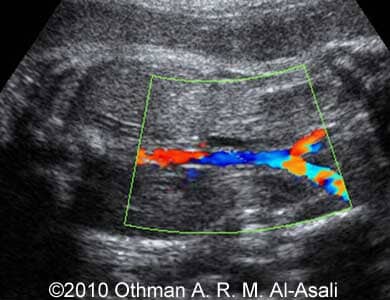 Images 1,2: Image 1 shows abdominal aorta and bifurcation, note absence of the renal arteries. Image 2 shows abdominal circumference, note absence of the amniotic fluid around the abdomen.