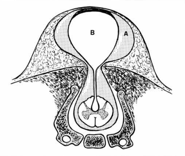 Cervical spinal dysraphism is rare, comprising only 3–8% of all cases of spinal dysraphism. It typically includes a cystic mass, which may be pedunculated or sessile, situated in the midline posteriorly and covered by skin, which is normal to thick at the base but thin and discoloured over the dome. There are two recognised subtypes: myelocystoceles and meningoceles. Steinbok and Cochrane hypothesize that the cervical meningocele and the myelocystocele are part of a spectrum of the same underlying developmental abnormality, namely limited dorsal myeloschisis, and the final presentation depends on the presence or absence of associated hydromyelia. The neural stalk, in continuity with the central canal, is considered the failure of the cutaneous ectoderm to separate from the neuroectoderm. If the central canal of the spinal canal is hydromyelic, the lumen of the neural stalk, which is in continuity with the central canal of the spinal cord, may be kept open, and fluid within the dorsal aspect of the stalk can distend the neuroglial tissue causing a dorsal sac. A meningocele sac surrounds the inner cyst and the space between these two sacs may be filled with cerebrospinal fluid in continuity with the subarachnoid space. The meningeal layer is covered by skin. In the absence of hydromyelia, the neural stalk narrows and regresses. The fibroneurovascular stalk may remain in a central position, as a band attaching the dorsal aspect of the spinal cord to the back of the meningocele sac, or may be displaced asymmetrically within the meningocele sac. This second form can be considered an “abortive” myelocystocele or “forme fruste” (Rossi type 1) versus previously described “complete” myelocystocele (Rossi type 2).