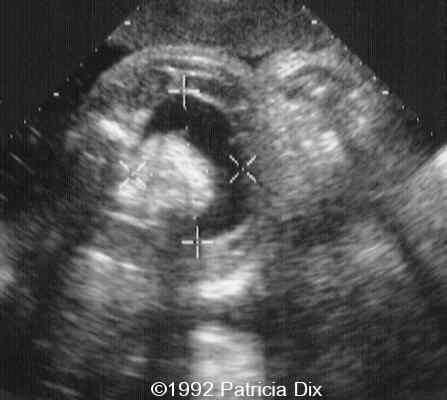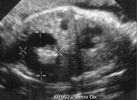 The few cases detected prenatally all presented as a complex mass. The general appearance is a well-delineated capsule, with an echogenic mass suspended in fluid or partially surrounded by fluid. Occasionally, the diagnosis can be suggested by the recognition of a rudimentary spine, as in the present case.