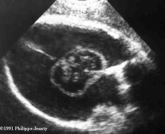 On ultrasound, hydrancephaly presents as a large cystic mass filling the entire cranial cavity with absence or discontinuity of the cerebral cortex and of the midline echo14. The appearance of the thalami and brainstem protruding inside a cystic cavity is characteristic. With either extreme hydrocephaly, alobar holoprosencephaly or porencephaly, these structures should still be surrounded by a rim of cortex, and the choroid plexuses should be normally visible. The initial diagnosis of hydrancephaly may be difficult when the infarction and hemorrhage is an evolving process. Recent hemorrhage is typically echogenic while an organizing clot assumes a more transonic texture15. Layering of this debris may masquerade as cortical tissue. Finally, the clot lyses and becomes an anechoic liquid characteristic of hydrancephaly15.